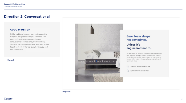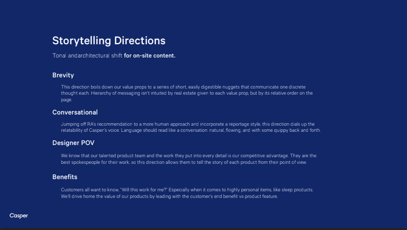The work featured here offers a behind-the-scenes look at internal strategy documents, meant to showcase the thinking, rigor, and process behind redefining Casper’s brand, not the final public-facing creative.